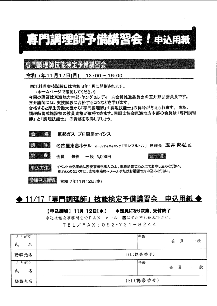 会費:司厨士協会 東海地方本部の会員 無料