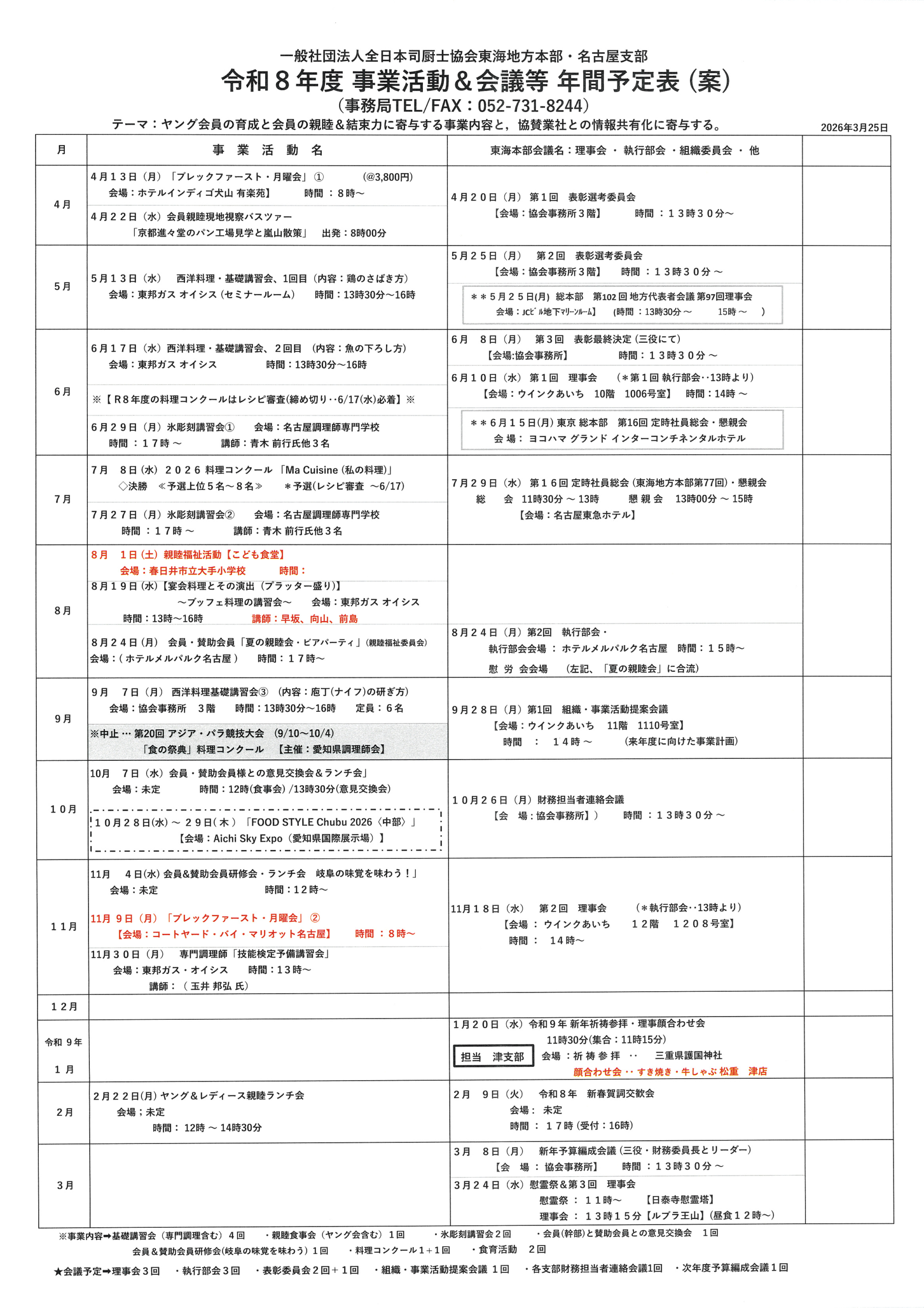 東海地方本部の令和8年度における活動予定表をホームページに掲載いたします。参考にしていただき、スケジュールを組んでいただけますと幸いです。~上半期の主な活動予定~5月13日(水) 鶏のさばき方講習会6月17日(水) 魚のおろし方講習会7月8日(水) Ma Cuisine料理コンクール決勝7月29日(水) 第16回定時社員総会8月24日(月) 会員・賛助会員様 夏の親睦会 NEWS イベント お知らせ よかったらシェアしてね! URL Copied! 2026年 Ma Cuisine(私の料理)料理コンクール 事前エントリー募集中です! 関連記事 令和2年 新春賀詞交歓会のお知らせ 2020.01.29 アプランティ会員になってみませんか? 2023.02.24 令和3年度 調理技術技能評価試験のお知らせ 2021.04.22 第29回 トック・ドール料理コンテスト 予選会のご案内 2022.06.10 令和7年度 第15回 東海地方本部 定時社員総会・懇親会のご案内 2025.06.02 有志による親睦ゴルフ会のおしらせ 2020.07.29 調理師免許をお持ちの皆様へ 2020.12.14 【10月16日開催】ブレックファースト月曜会③ 2023.09.22